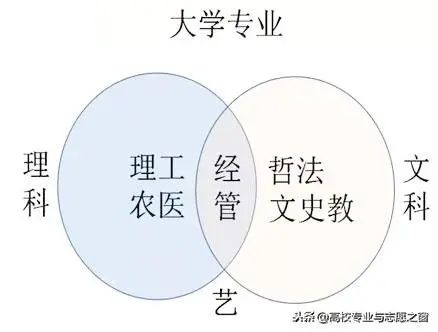 在过去的40年里,一直使用文理分科的高考制度下,文科生、理科生能选报的大学专业,大致可对应如下的关系图(军事学专业也有文理之分,但以理科为主。因属于提前批招生,该图未包含在内):