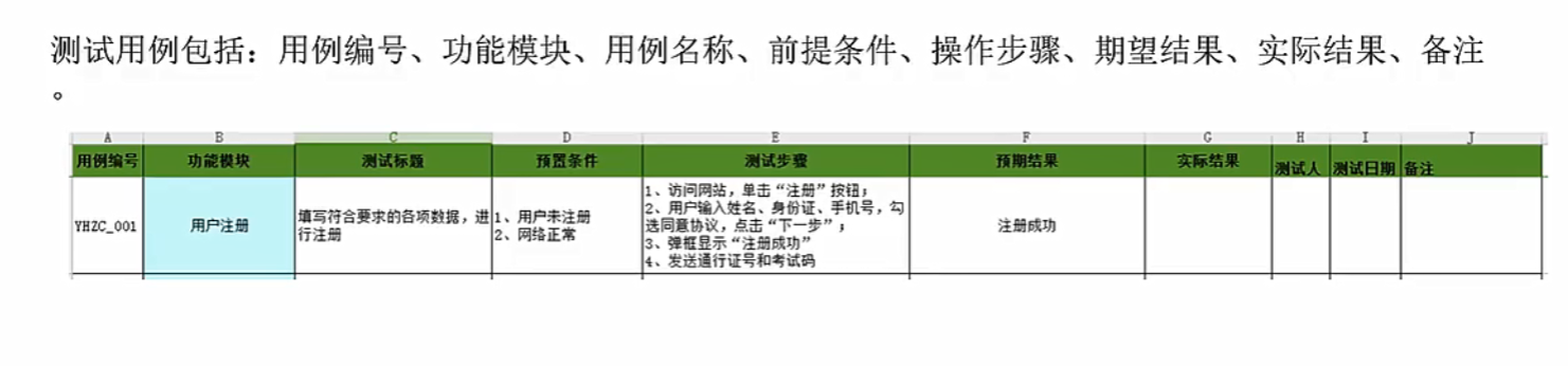 测试用例包括:用例编号,功能模块,用例名称,前提条件,操作步骤,期望结果,实际结果,备注。