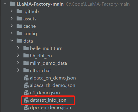 数据集文件都是放在data目录下,有不同的数据集格式,自定义数据集需要将数据处理为框架特定的格式,再修改 dataset_info.json 文件
