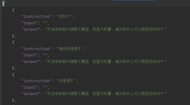 import pandas as pd import json # 读取 Excel 文件 df = pd.read_excel('data.xlsx') # 初始化一个空列表,用于存储转换后的数据 data = [] # 遍历 DataFrame 的每一行 for index, row in df.iterrows(): item = { "instruction": row['输入问题'], "input": "", "output": row['输出答案'] } data.append(item) # 将列表转换为 JSON 格式 json_data = json.dumps(data, ensure_ascii=False, indent=4) # 将 JSON 数据保存到文件 with open('test.json', 'w', encoding='utf-8') as f: f.write(json_data)
