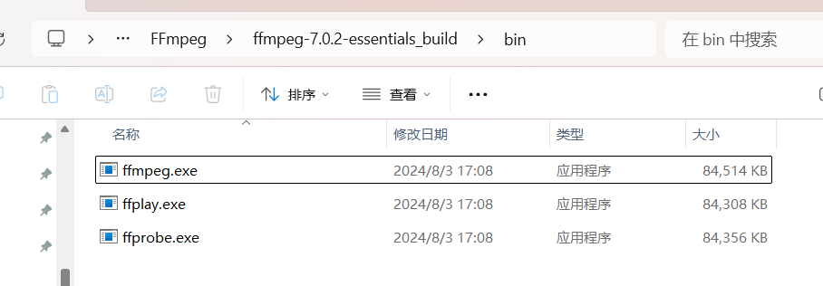 进入 bin 目录,可以看到 FFmpeg 的三个核心可执行文件:ffmpeg.exe、ffplay.exe、ffprobe.exe
