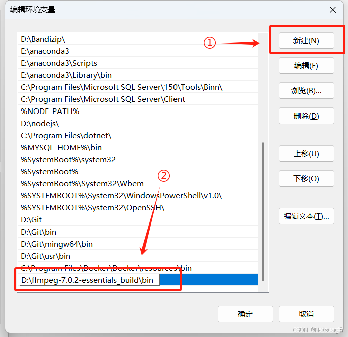 找到“系统变量”中的 Path 条目并点击“编辑”,输入 FFmpeg 的 bin 文件夹路径