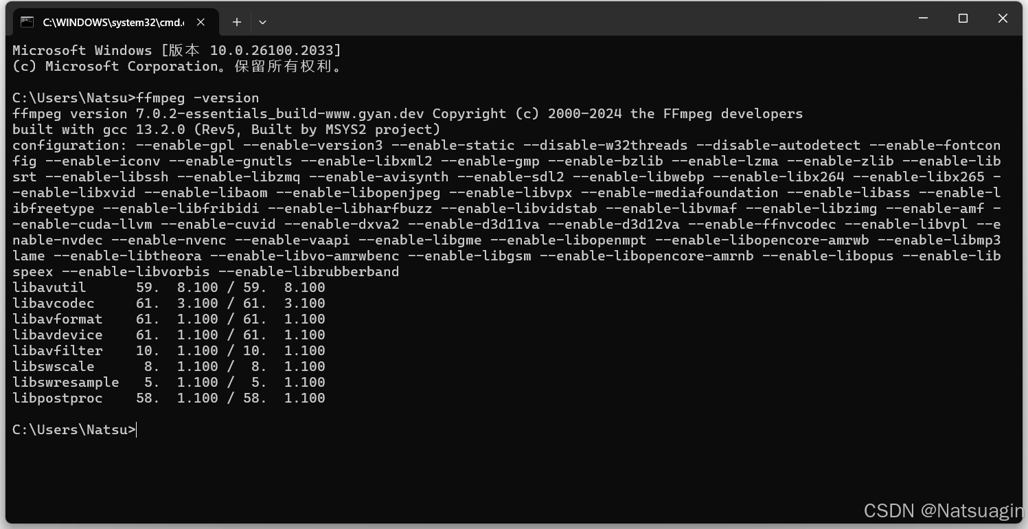 在cmd命令行中输入以下命令查看 FFmpeg 版本,ffmpeg -version