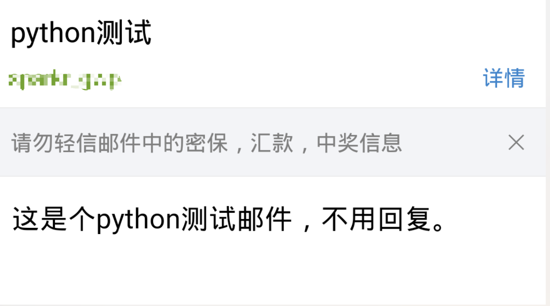 # -*- coding:utf-8 -*- import smtplib from email.mime.text import MIMEText #邮箱地址 email_host = 'smtp.163.com' # 发送者账号 email_user = 'xxx@163.com' # 发送者的密码,这里是🈯️授权码,授权码,授权码!重要的事说三遍! email_pwd = 'xxx' # 收件人的邮箱 maillist ='xxx@qq.com' me = email_user # 邮件内容 msg = MIMEText('这个是Python 测试邮件,不用回复!') # 邮件主题 msg['Subject'] = 'python测试' # 发送者账号 msg['From'] = me # 接收者账号列表,多个账号可以用逗号隔开 msg['To'] = maillist # 连接邮箱,传入邮箱地址,和端口号,smtp的端口号是25 smtp = smtplib.SMTP(email_host, port=25) # 发送者的邮箱账号,密码 smtp.login(email_user, email_pwd) # 参数分别是发送者,接收者,第三个是把上面的发送邮件的内容变成字符串 smtp.sendmail(me, maillist, msg.as_string()) # 发送完毕后退出smtp smtp.quit() print ('email send success.')