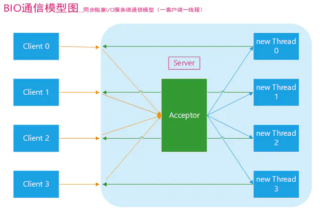 所谓BIO,就是Block IO,阻塞式的IO。这个阻塞主要发生在:ServerSocket接收请求时、InputStream、OutputStream(输入输出流的读和写)都是阻塞的。