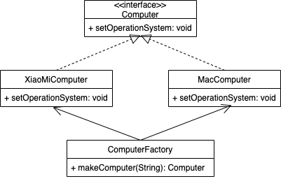 1 public interface Computer { 2 3 void setComputerSystem(); 4 5 } 6 7 public class XiaoMiComputer implements Computer { 8 9 @Override 10 public void setComputerSystem() { 11 System.out.println("XiaoMiComputer"); 12 } 13 14 } 15 16 public class MacComputer implements Computer { 17 18 @Override 19 public void setComputerSystem() { 20 System.out.println("MacComputer"); 21 } 22 23 } 24 25 public class ComputerFactory { 26 27 public static Computer makeComputer(String brand) { 28 if (brand == null) { 29 return null; 30 } 31 32 Computer computer = null; 33 34 if (brand.equalsIgnoreCase("XiaoMi")) { 35 computer = new XiaoMiComputer(); 36 } else if (brand.equalsIgnoreCase("apple")) { 37 computer = new MacComputer(); 38 } 39 40 return computer; 41 } 42 43 } 44 45 public class UseSimpleFactory { 46 47 public static void main(String[] args) { 48 Computer computer = ComputerFactory.makeComputer("XiaoMi"); 49 computer.setComputerSystem(); 50 51 computer = ComputerFactory.makeComputer("apple"); 52 computer.setComputerSystem(); 53 } 54 55 }