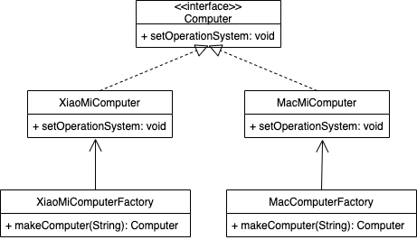 1 public interface Computer { 2 3 void setComputerSystem(); 4 5 } 6 7 public class XiaoMiComputer implements Computer { 8 9 @Override 10 public void setComputerSystem() { 11 System.out.println("XiaoMiComputer"); 12 } 13 14 } 15 16 public class MacComputer implements Computer { 17 18 @Override 19 public void setComputerSystem() { 20 System.out.println("MacComputer"); 21 } 22 23 } 24 25 public class XiaoMiComputerFactory { 26 27 public static Computer makeComputer() { 28 return new XiaoMiComputer(); 29 } 30 31 } 32 33 public class MacComputerFactory { 34 35 public static Computer makeComputer() { 36 return new MacComputer(); 37 } 38 39 } 40 41 public class UseFactoryMethodPattern { 42 43 public static void main(String[] args) { 44 Computer computer = XiaoMiComputerFactory.makeComputer(); 45 computer.setComputerSystem(); 46 47 computer = MacComputerFactory.makeComputer(); 48 computer.setComputerSystem(); 49 } 50 51 }