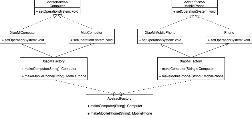 1 public interface Computer { 2 3 void setComputerSystem(); 4 5 } 6 7 public class XiaoMiComputer implements Computer { 8 9 @Override 10 public void setComputerSystem() { 11 System.out.println("XiaoMiComputerOS"); 12 } 13 14 } 15 16 public class MacComputer implements Computer { 17 18 @Override 19 public void setComputerSystem() { 20 System.out.println("MacComputerOS"); 21 } 22 23 } 24 25 public interface MobilePhone { 26 27 void setOperationSystem(); 28 29 } 30 31 public class XiaoMiPhone implements MobilePhone { 32 33 @Override 34 public void setOperationSystem() { 35 System.out.println("XiaoMiPhoneOS"); 36 } 37 38 } 39 40 public class iPhone implements MobilePhone { 41 42 @Override 43 public void setOperationSystem() { 44 System.out.println("iPhoneOS"); 45 } 46 47 } 48 49 public interface AbstractFactory { 50 51 Computer makeComputer(); 52 MobilePhone makeMobilePhone(); 53 54 } 55 56 57 public class XiaoMiFactory implements AbstractFactory { 58 59 @Override 60 public Computer makeComputer() { 61 return new XiaoMiComputer(); 62 } 63 64 @Override 65 public MobilePhone makeMobilePhone() { 66 return new XiaoMiPhone(); 67 } 68 69 } 70 71 public class AppleFactory implements AbstractFactory { 72 73 @Override 74 public Computer makeComputer() { 75 return new MacComputer(); 76 } 77 78 @Override 79 public MobilePhone makeMobilePhone() { 80 return new iPhone(); 81 } 82 83 } 84 85 86 public class FactoryProducer { 87 88 public static AbstractFactory getFactory(String brand) { 89 if (brand == null) { 90 return null; 91 } 92 93 if (brand.equalsIgnoreCase("Apple")) { 94 return new AppleFactory(); 95 } else if (brand.equalsIgnoreCase("XiaoMi")) { 96 return new XiaoMiFactory(); 97 } 98 99 return null; 100 } 101 102 } 103 104 public class UseAbstractFactoryPattern { 105 106 public static void main(String[] args) { 107 AbstractFactory appleFactory = FactoryProducer.getFactory("Apple"); 108 Computer computer = appleFactory.makeComputer(); 109 computer.setComputerSystem(); 110 MobilePhone mobilePhoneFactory = appleFactory.makeMobilePhone(); 111 mobilePhoneFactory.setOperationSystem(); 112 113 AbstractFactory xiaoMiFactory = FactoryProducer.getFactory("XiaoMi"); 114 computer = xiaoMiFactory.makeComputer(); 115 computer.setComputerSystem(); 116 mobilePhoneFactory = xiaoMiFactory.makeMobilePhone(); 117 mobilePhoneFactory.setOperationSystem(); 118 } 119 120 }