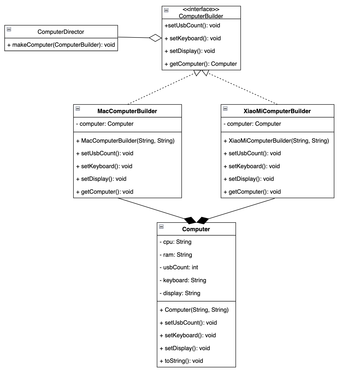 1 public class Computer { 2 3 private String cpu; 4 private String ram; 5 private int usbCount; 6 private String keyboard; 7 private String display; 8 9 public Computer(String cpu, String ram) { 10 this.cpu = cpu; 11 this.ram = ram; 12 } 13 14 public void setUsbCount(int usbCount) { 15 this.usbCount = usbCount; 16 } 17 18 public void setKeyboard(String keyboard) { 19 this.keyboard = keyboard; 20 } 21 22 public void setDisplay(String display) { 23 this.display = display; 24 } 25 26 @Override 27 public String toString() { 28 return "Computer{" + 29 "cpu='" + cpu + '\'' + 30 ", ram='" + ram + '\'' + 31 ", usbCount=" + usbCount + 32 ", keyboard='" + keyboard + '\'' + 33 ", display='" + display + '\'' + 34 '}'; 35 } 36 } 37 38 39 public interface ComputerBuilder { 40 41 void setUsbCount(); 42 43 void setKeyboard(); 44 45 void setDisplay(); 46 47 Computer getComputer(); 48 49 } 50 51 52 public class ComputerDirector { 53 54 public void makeComputer(ComputerBuilder builder) { 55 builder.setUsbCount(); 56 builder.setKeyboard(); 57 builder.setDisplay(); 58 } 59 60 } 61 62 63 public class MacComputerBuilder implements ComputerBuilder { 64 private Computer computer; 65 66 public MacComputerBuilder(String cpu, String ram) { 67 computer = new Computer(cpu, ram); 68 } 69 70 @Override 71 public void setUsbCount() { 72 computer.setUsbCount(4); 73 } 74 75 @Override 76 public void setKeyboard() { 77 computer.setKeyboard("苹果键盘"); 78 } 79 80 @Override 81 public void setDisplay() { 82 computer.setDisplay("苹果显示器"); 83 } 84 85 @Override 86 public Computer getComputer() { 87 return computer; 88 } 89 90 }