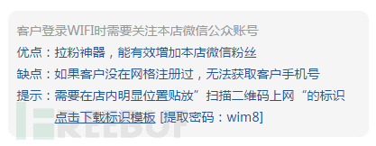 现在很多商用WiFi都采用了“微信关注免费上网”的策略,网格WiFi同样采取了这种模式,并直截了当地总结了此举的“优缺点”。试问网格及商家:“如果客户没有在网格注册过,无法获取客户手机号”怎么就是产品缺点了?你们在获取客户信息的时候,难道没想过这需要征求谁的同意吗?