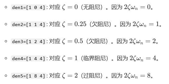 %固定阻尼比,变化角频率: 这是本部分的核心思想。阻尼比被固定为 0.25。num_1, num_2, ..., num_4: 分子系数向量den_1, den_2, ..., den_4: 分母系数向量。figure: 创建一个新的图形窗口,与第一部分的图分开显示。step(...)和text(...): 同样,使用step绘制响应曲线,hold on保持图形xlabel, ylabel, title: 为第二张图添加标签和标题。