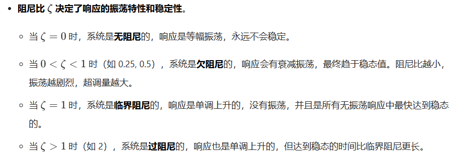 - 阻尼比主要影响响应的振荡性和稳定性。它决定了系统是振荡还是单调,以及振荡的衰减速度。