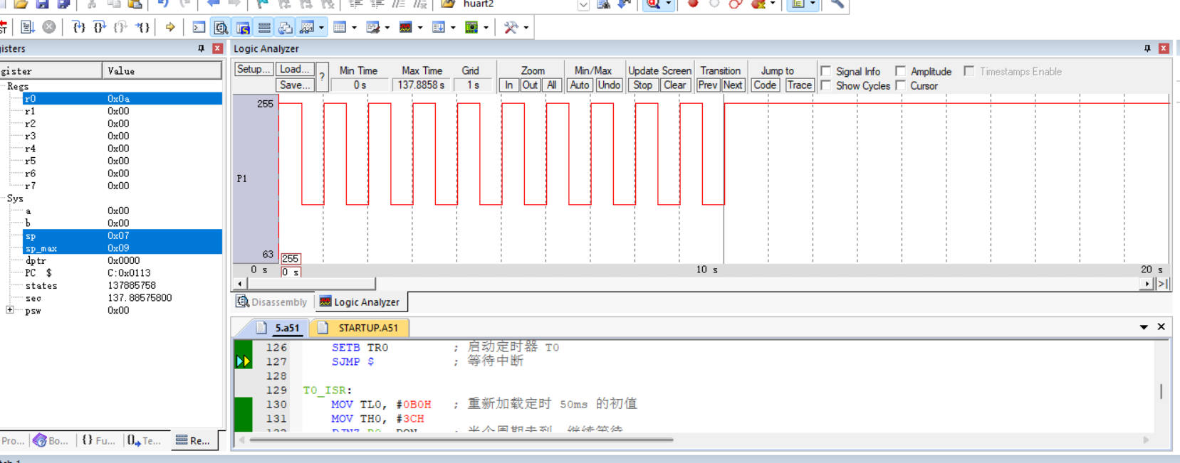 使用定时器 T0,在 P1.7 引脚输出周期位 1S 的方波,输出 10 个后停止。