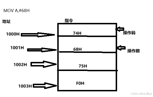 指令在存储器中是以二进制数的形式,以字节(1个字节8位也就是2个16进制数)为单位,按照地址递增的顺序存放的,先存放操作码然后是操作数