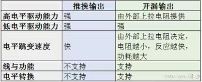 3.在开漏输出模式:在开漏输出模式下,若控制输出为1,则输出既不是高电平也不是低电平,而是高组态,为使该模式正常工作,通常必须在外部接一个上拉电阻