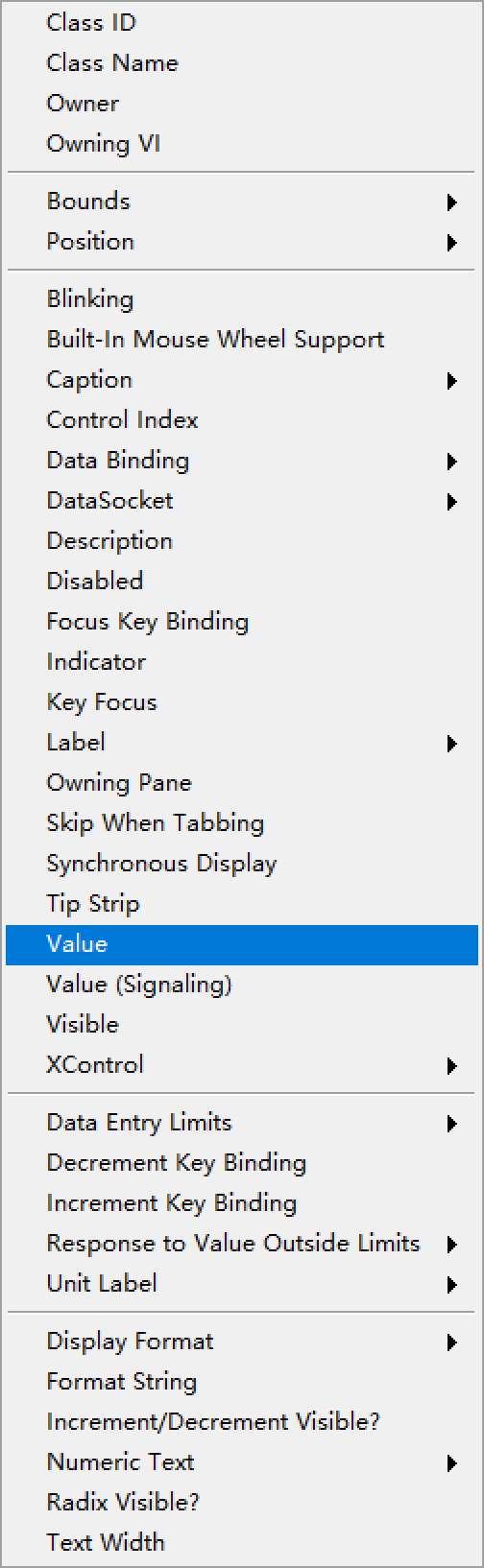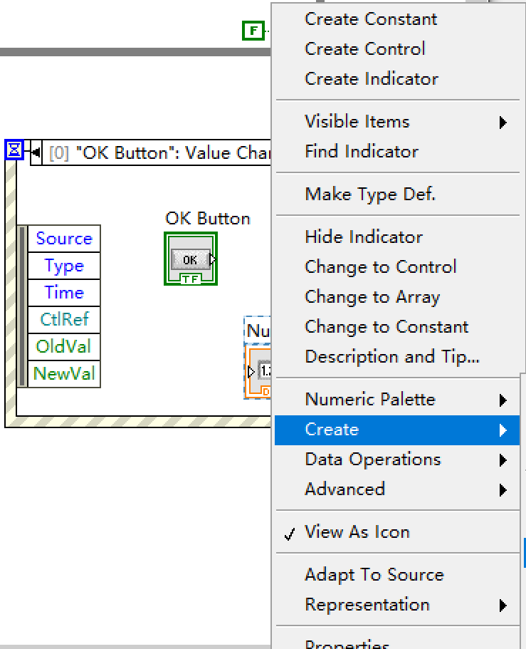 右键数字指示器,选择create,点击Property Node,选择Value
