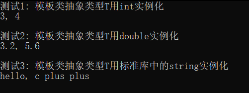 #include <iostream> #include <string> using namespace std; // 定义类模板X template<typename T> class X{ public: X(T x0, T y0): x{x0}, y{y0} {} void show() const { cout << x << ", " << y << endl;} private: T x, y; }; void test() { cout << "测试1: 模板类抽象类型T用int实例化" << endl; X<int> x1(3, 4); x1.show(); cout << "\n测试2: 模板类抽象类型T用double实例化" << endl; X<double> x2(3.2, 5.6); x2.show(); cout << "\n测试3: 模板类抽象类型T用标准库中的string实例化" << endl; X<std::string> x3("hello", "c plus plus"); x3.show(); } int main() { test(); }