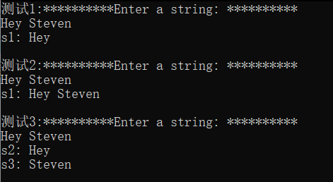 #include <iostream> #include <string> #include <limits> using namespace std; int main() { const int n = 10; string prompt = string(n, '*') + "Enter a string: " + string(n, '*') + '\n'; cout << "测试1:"; cout << prompt; string s1; cin >> s1; // 从输入流中提取字符串给s1,碰到空格、回车、Tab键即结束 cout << "s1: " << s1 << endl; cin.ignore(numeric_limits<streamsize>::max(), '\n'); // 清空输入缓冲区 cout << "\n测试2:"; cout << prompt; getline(cin, s1); // 从输入流中提取一行字符串给s1,直到换行 cout << "s1: " << s1 << endl; cout << "\n测试3:"; string s2, s3; cout << prompt; getline(cin, s2, ' '); // 从输入流中提取字符串给s2,直到指定分隔符空格 getline(cin, s3); cout << "s2: " << s2 << endl; cout << "s3: " << s3 << endl; }
