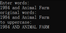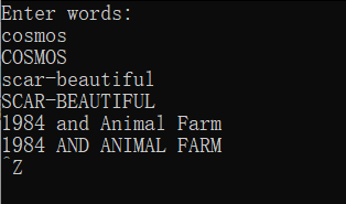 #include <iostream> #include <string> int main() { using namespace std; string s; cout << "Enter words: \n"; // 重复录入字符串,将小写字符转换成大写,直到按下Ctrl+Z while( getline(cin, s) ) { for(auto &ch: s) ch = toupper(ch); cout << s << "\n"; } }