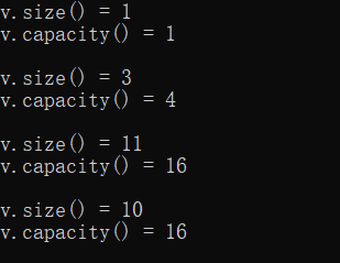 #include <iostream> #include <vector> using namespace std; void output(const vector<int> &v) { cout << "v.size() = " << v.size() << endl; cout << "v.capacity() = " << v.capacity() << endl; cout << endl; } int main() { vector<int> v{42}; output(v); v.push_back(55); v.push_back(90); output(v); for(auto i = 0; i < 8; ++i) v.push_back(i); output(v); v.pop_back(); output(v); }