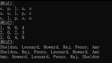 #include <iostream> #include <vector> #include <array> #include <string> #include <algorithm> using namespace std; // 函数模板 // 通过索引方式输出对象值 template<typename T> void output1(const T &obj) { for(auto i = 0; i < obj.size(); ++i) cout << obj.at(i) << ", "; cout << "\b\b \n"; } // 函数模板 // 通过迭代器方式输出对象值 template<typename T> void output2(const T &obj) { for(auto p = obj.cbegin(); p != obj.cend(); ++p) cout << *p << ", "; cout << "\b\b \n"; } // 函数模板 // 通过auto for方式输出对象值 template<typename T> void output3(const T &obj) { for(auto &item: obj) cout << item << ", "; cout << "\b\b \n"; } // 测试string类对象 void test1() { string s1{"cplus"}; output1(s1); reverse(s1.begin(), s1.end()); // 对对象s1中的数据项进行翻转 output2(s1); sort(s1.begin(), s1.end()); // 对对象s1中的数据项排序(默认升序) output3(s1); } // 测试array<int>类对象 void test2() { array< array<int, 4>, 3> x{1, 9, 8, 4, 2, 0, 2, 3, 2, 0, 4, 9 }; output1( x.at(0) ); output2( x.at(1) ); output3( x.at(2) ); } // 测试vector<string>类对象 void test3() { vector<string> v1 {"Sheldon", "Leonard", "Howard", "Raj"}; v1.push_back("Penny"); v1.push_back("Amy"); output1(v1); sort(v1.begin(), v1.end(), std::greater<string>()); // 对v1对象中的字符串按降序排序 output2(v1); reverse(v1.begin(), v1.end()); // 对v1对象中的字符串翻转 output3(v1); } int main() { cout << "测试1: " << endl; test1(); cout << "测试2: " << endl; test2(); cout << "测试3: " << endl; test3(); }