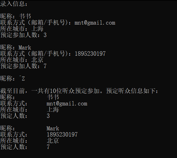 #include "Info.hpp" #include <iostream> #include <vector> #include<limits> using namespace std; const int capacity = 100; void test() { vector<Info> audience_info_list; cout << "录入信息:\n\n"; string nickname, contact, city; int n; int N = 0; while ( N <= capacity) { // 录入信息 cout << "昵称:"; cin >> nickname; if (cin.eof()) { break; // Ctrl+Z 导致循环中止 } cout << "联系方式(邮箱/手机号):"; cin >> contact; cout << "所在城市:"; cin >> city; cout << "预定参加人数:"; cin >> n; cout << endl; if (cin.eof()) { break; // Ctrl+Z 导致循环中止 } N += n; //判断预定参加人数是否超过livehouse场地剩余容量 if (N > capacity) { N -= n; int remain = capacity - N; char choice; cout << "对不起,只剩" << remain << "个位置。\n"; cout << "1.输入u,更新(update)预定信息\n"; cout << "2.输入q,退出预定\n"; cout << "你的选择:"; cin >> choice; if (choice == 'q') { cout << "退出预定。\n"; break; } else if (choice == 'u') { cin.clear(); cin.ignore(numeric_limits<streamsize>::max(), '\n'); cout << "请重新输入信息。\n"; continue; } } audience_info_list.emplace_back(nickname, contact, city, n); } // 打印预约参加livehouse的听众信息 cout << "\n截至目前,一共有" << N << "位听众预定参加。预定听众信息如下:" << endl; for (const auto& info : audience_info_list) { info.print(); } } int main() { test(); return 0; }
