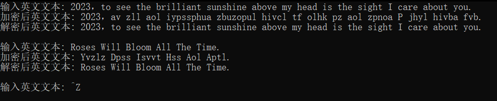 #include "textcoder.hpp" #include <iostream> #include <string> void test() { using namespace std; string text, encoded_text, decoded_text; cout << "输入英文文本: "; while (getline(cin, text)) { encoded_text = TextCoder(text).get_ciphertext(); // 这里使用的是临时无名对象 cout << "加密后英文文本:\t" << encoded_text << endl; decoded_text = TextCoder(encoded_text).get_deciphertext(); // 这里使用的是临时无名对象 cout << "解密后英文文本:\t" << decoded_text << endl; cout << "\n输入英文文本: "; } } int main() { test(); }