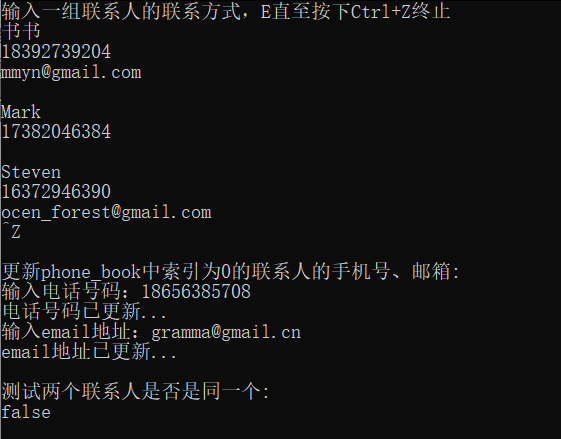 #include <iostream> #include <vector> #include "Person.hpp" void test() { using namespace std; vector<Person> phone_book; Person p; cout << "输入一组联系人的联系方式,E直至按下Ctrl+Z终止\n"; while (cin >> p) { phone_book.push_back(p); } cout << "\n更新phone_book中索引为0的联系人的手机号、邮箱:\n"; phone_book.at(0).update_telephone(); phone_book.at(0).update_email(); cout << "\n测试两个联系人是否是同一个:\n"; cout << boolalpha << (phone_book.at(0) == phone_book.at(1)) << endl; } int main() { test(); }