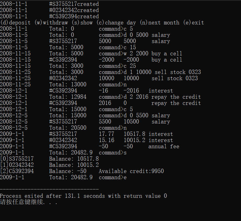#include"account.h" #include<iostream> using namespace std; void test() { Date date(2008, 11, 1); //建立几个账户 SavingsAccount sa1(date, "S3755217", 0.015); SavingsAccount sa2(date, "02342342", 0.015); CreditAccount ca(date, "C5392394", 10000, 0.0005, 50); Account* accounts[] = { &sa1,&sa2,&ca }; const int n = sizeof(accounts) / sizeof(Account*); cout << "(d)deposit (w)withdraw (s)show (c)change day (n)next month (e)exit" << endl; char cmd; do { date.show(); cout << "\tTotal: " << Account::getTotal() << "\tcommand>"; int index, day; double amount; string desc; cin >> cmd; switch (cmd) { case 'd': cin >> index >> amount; getline(cin, desc); accounts[index]->deposit(date, amount, desc); break; case 'w': cin >> index >> amount; getline(cin, desc); accounts[index]->withdraw(date, amount, desc); break; case 's': for (int i = 0; i < n; i++) { cout << "[" << i << "]"; accounts[i]->show(); cout << endl; } break; case 'c': cin >> day; if (day < date.getDay()) cout << "You cannot specify a previous day"; else if (day > date.getMaxDay()) cout << "Invalid day"; else date = Date(date.getYear(), date.getMonth(), day); break; case 'n': if (date.getMonth() == 12) date = Date(date.getYear() + 1, 1, 1); else date = Date(date.getYear(), date.getMonth() + 1, 1); for (int i = 0; i < n; i++) accounts[i]->settle(date); break; } } while (cmd != 'e'); } int main() { test(); return 0; }