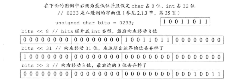 << 和 >> 运算符的内置含义是对其运算对象执行基于二进制位的移动操作,首先令左侧运算对象的内容按照右侧运算对象的要求移动指定位数,然后将经过移动的左侧运算对象的拷贝结果作为求值结果。右侧对象一定不能为负,而且值必须严格小于结果的位数,否则就会产生未定义的行为。