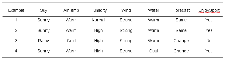 1 def find_s(): 2 x1 = ['sunny', 'warm', 'nurmal', 'strong', 'warm', 'same', 1] 3 x2 = ['sunny', 'warm', 'high', 'strong', 'warm', 'same', 1] 4 x3 = ['rainy', 'cold', 'high', 'strong', 'warm', 'change', 0] 5 x4 = ['sunny', 'warm', 'high', 'strong', 'cool', 'change', 1] 6 7 h = [None, None, None, None, None, None] 8 h1 = ['sunny', 'warm', 'nurmal', 'strong', 'warm', 'same'] //初始化 9 10 xa = [x1, x2, x3, x4] 11 12 xb = [x1, x2, x4, x3] 13 14 for i in xb: 15 if i[6] == 1: 16 index = 0 17 for j in i[:-1]: 18 if (h1[index] == None): 19 h1[index] = j 20 elif (h1[index] != j): 21 h1[index] = '?' 22 index += 1 23 print(h1) 24 25 if __name__ == "__main__": 26 find_s()
