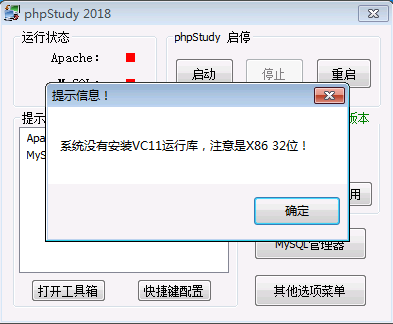 完成安装后,启动运行,可能会提示“系统没有安装VC11运行库,注意是X86 32位!”,点击确定,会跳转到http://www.php.cn/xiazai/gongju/1351的页面,根据提示安装所需要的运行库。