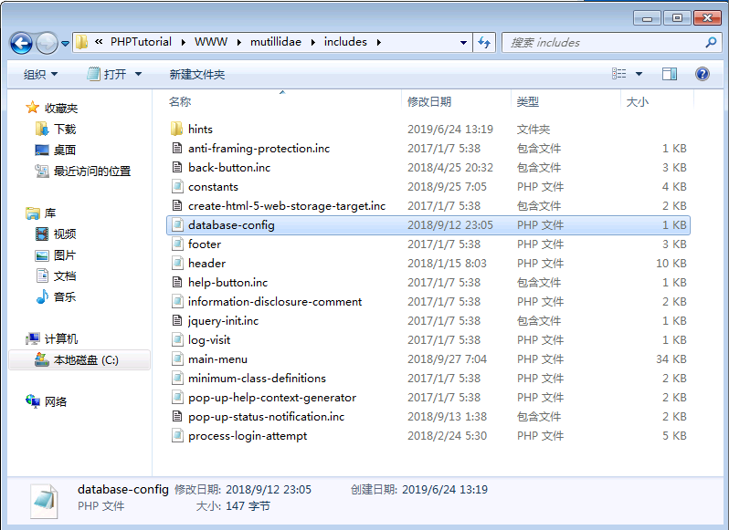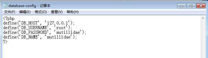 ④ 配置C:\phpStudy\PHPTutorial\WWW\mutillidae\includes目录下的database-config.php文件,可使用记事本打开查看代码内容。