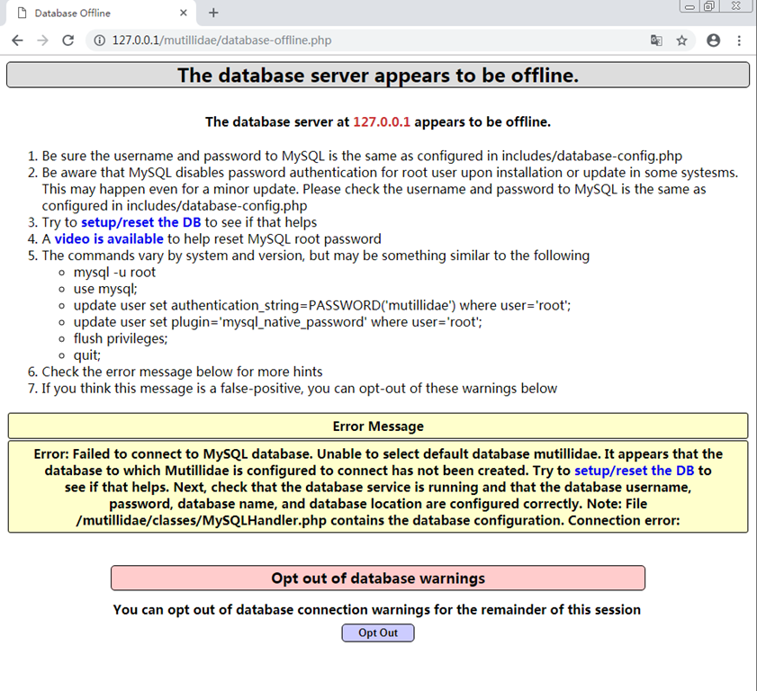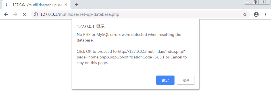 重启phpstudy,开启服务,如果是在本地使用Mutillidae漏洞靶场,在浏览器输入“http://127.0.0.1/mutillidae/”(如果是在其他机器上访问平台,需要将127.0.0.1改为搭建平台服务器的IP地址),第一次启动,会跳转到“http://127.0.0.1/mutillidae/database-offline.php”,需要重置数据库,点击“setup/reset the DB”,弹出提示框,点击确定,进入漏洞平台首页,就可以开始使用Mutillidae漏洞靶场了。