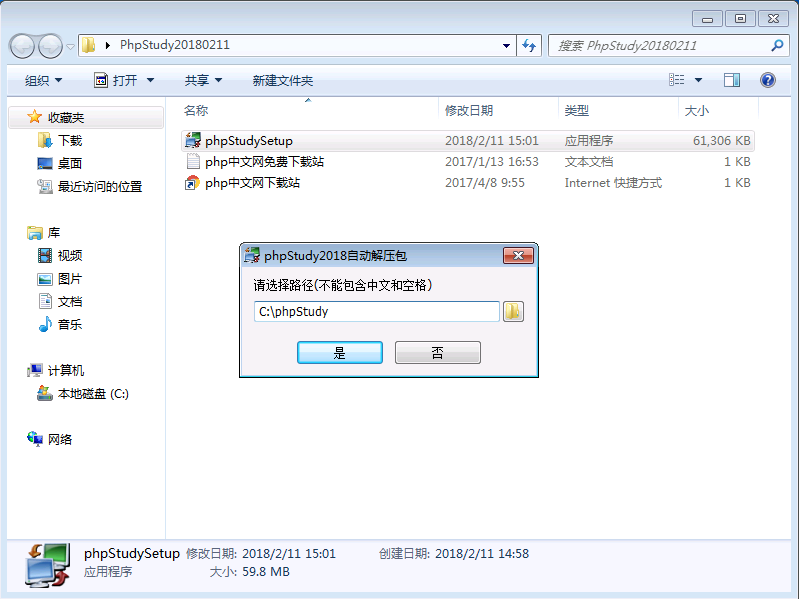 打开解压后的文件夹,双击运行phpStuySetup.exe,选择安装路径(不能包含中文和空格)。