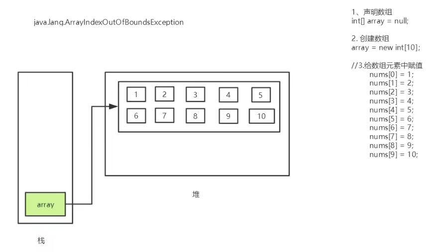 //声明和创建合并:int[] nums2 = new int[]; //3.给数组元素赋值 nums[0] = 1; nums[1] = 2; nums[2] = 3; nums[3] = 4; nums[4] = 5; nums[5] = 6; nums[6] = 7; nums[7] = 8; nums[8] = 9; nums[9] = 0; //计算所有元素的和 int sum = 0; //获取数组长度:array.length for(int i = 0;i < nums.length; i++){ sum = sum +nums[i]; } System.out.println("总和为:"+sum); } } //总和为:45
