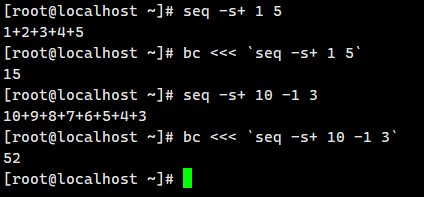 - 解释: seq -s+ 使用 -s 选项来指定输出的分隔符为 +,这意味着输出的数字之间会用 + 符号连接。
