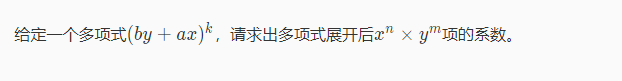 思想:从题意中很容易看出需要二项式定理,根据二次项式定理能求出来((ax)^n)*(by)^m的系数c,然后再用c*(a^n)*(b^m), 这一步分理所当然需要快速幂,后来发现结果需要模10007,所以必不可少同余模定理。因为二项式定理,所以立刻想到了排列组合公式: