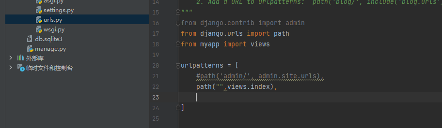 from myapp import views # 导入视图文件 urlpatterns = [ #path('admin/', admin.site.urls), path("",views.index), ]