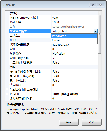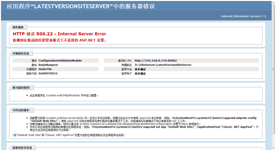 第一个是网站搭建好后运行报错,提示“检测到在集成的托管管道模式下不适用”。解决方法为在网站对就的应用程序池中选择高级设置,将托管管道模式的值Integrated修改为Classic。