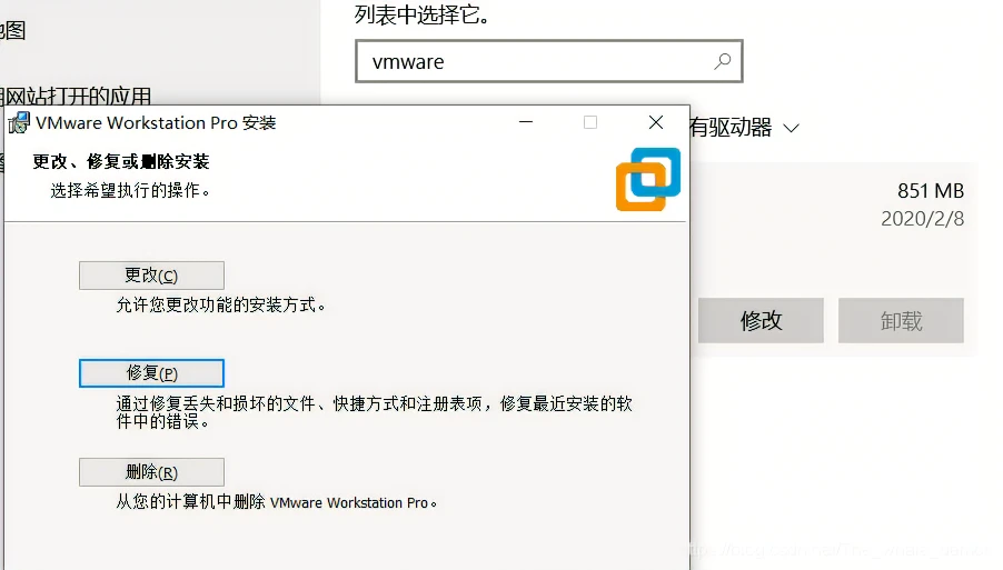 打开控制面板–>点击应用–>在搜索框中输入:vmware搜索–>点击修改或卸载–>进行修复