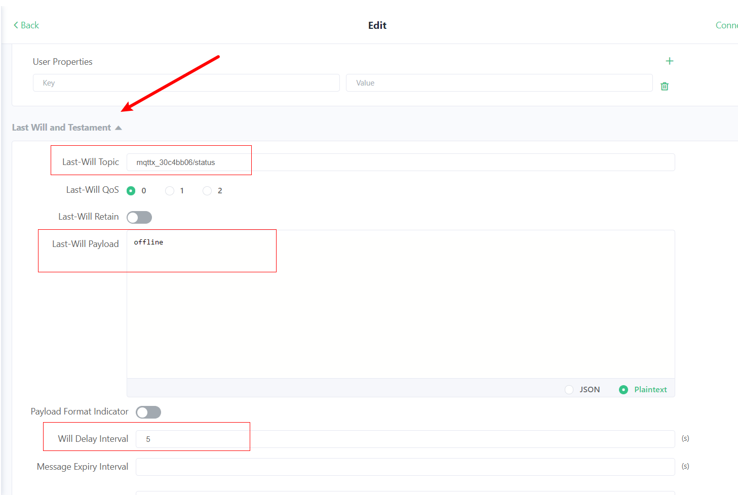 在 MQTT 中,客户端可以在连接时在服务端中注册一个遗嘱消息,与普通消息类似,我们可以设置遗嘱消息的主题、有效载荷等等。当该客户端意外断开连接,服务端就会向其他订阅了相应主题的客户端发送此遗嘱消息。(客户端主动断开连接不会发送遗嘱消息,例如MQTTX中的disconnected)