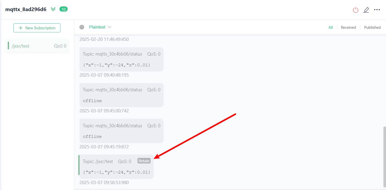 MQTT 服务器会为每个主题存储最新一条保留消息,以方便消息发布后才上线的客户端在订阅主题时仍可以接收到该消息。