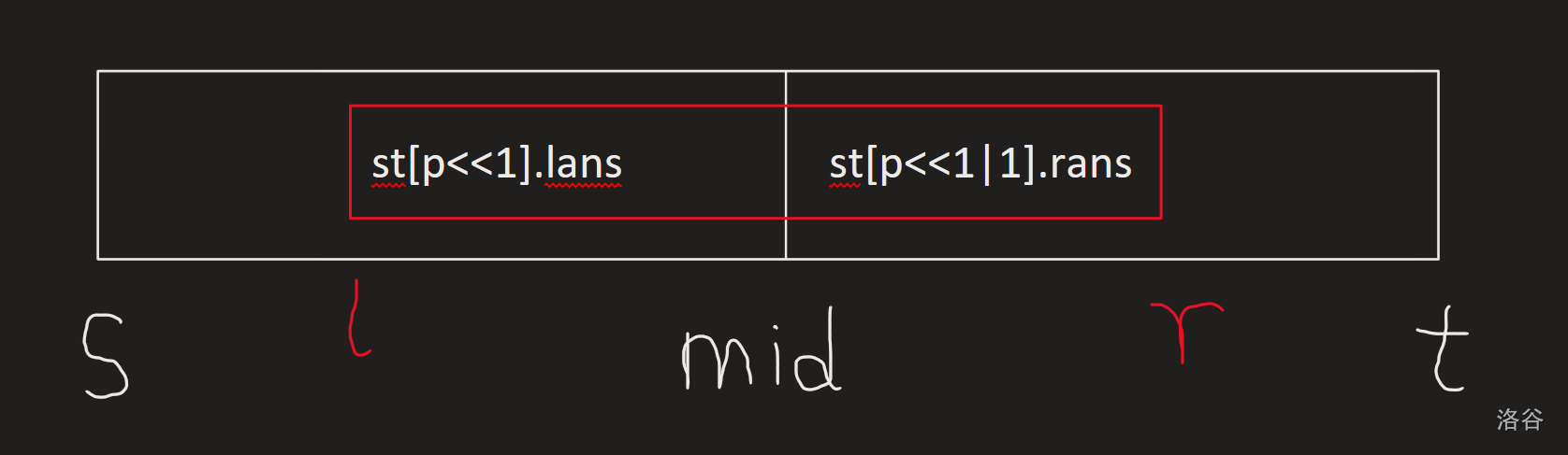 这个区间(即 \([l,r]\) )在 \(mid\) 前的部分因为右端点是 \(mid\) 且满足局部最优,所以它的区间和等于 \(st_{2p,rans}\)。