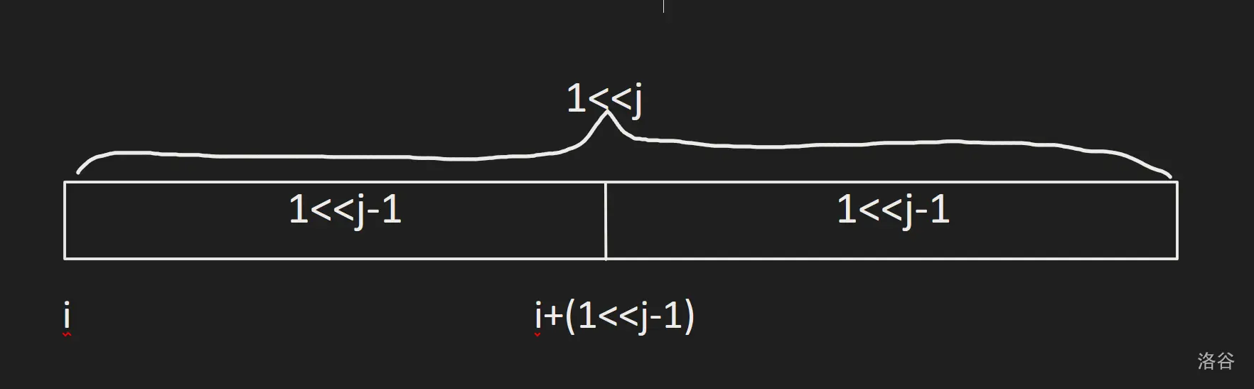 我们把这个长度为 \(2^j\) 的区间劈成两半,每一半的长度都是 \(2^{j-1}\),那么左半边区间的起点就是 \(i\),右半边区间的起点就是 \(i+2^{j-1}\),整个区间的最大值就是左半边区间的最大值和右半边区间的最大值的最大值,即为: