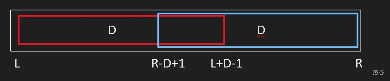因为 \(D>\lfloor\frac{len}{2}\rfloor\) ,所以这两个区间必能将 \([l,r]\) 完全覆盖。