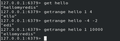 7)getrange key start end:获取key中字符串值从start开始到end结束的字符串,包括start和end,负数表示从字符串的末尾开始,-1表示最后一个字符