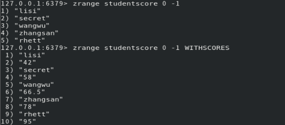 2)zrange key start stop [WITHSCORES] :查询有序集合,指定区间的内的元素。