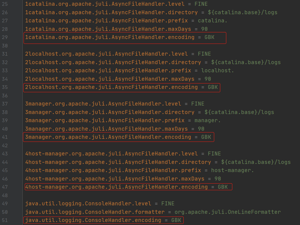 打开tomcat目录下conf文件夹下的logging.properties配置文件,将下列标红处所有改为GBK则完美解决乱码问题