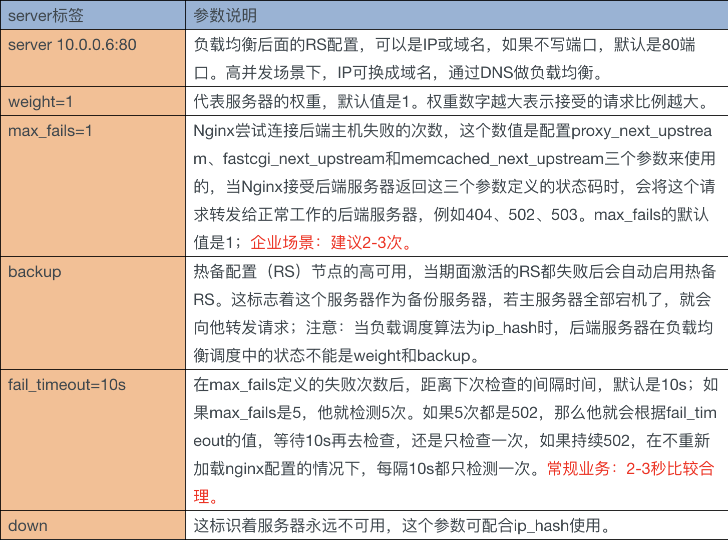 server 10.0.0.6:80 weight=1 max_fails=1 fails_timeout=10s; #<==此行标签为默认配置